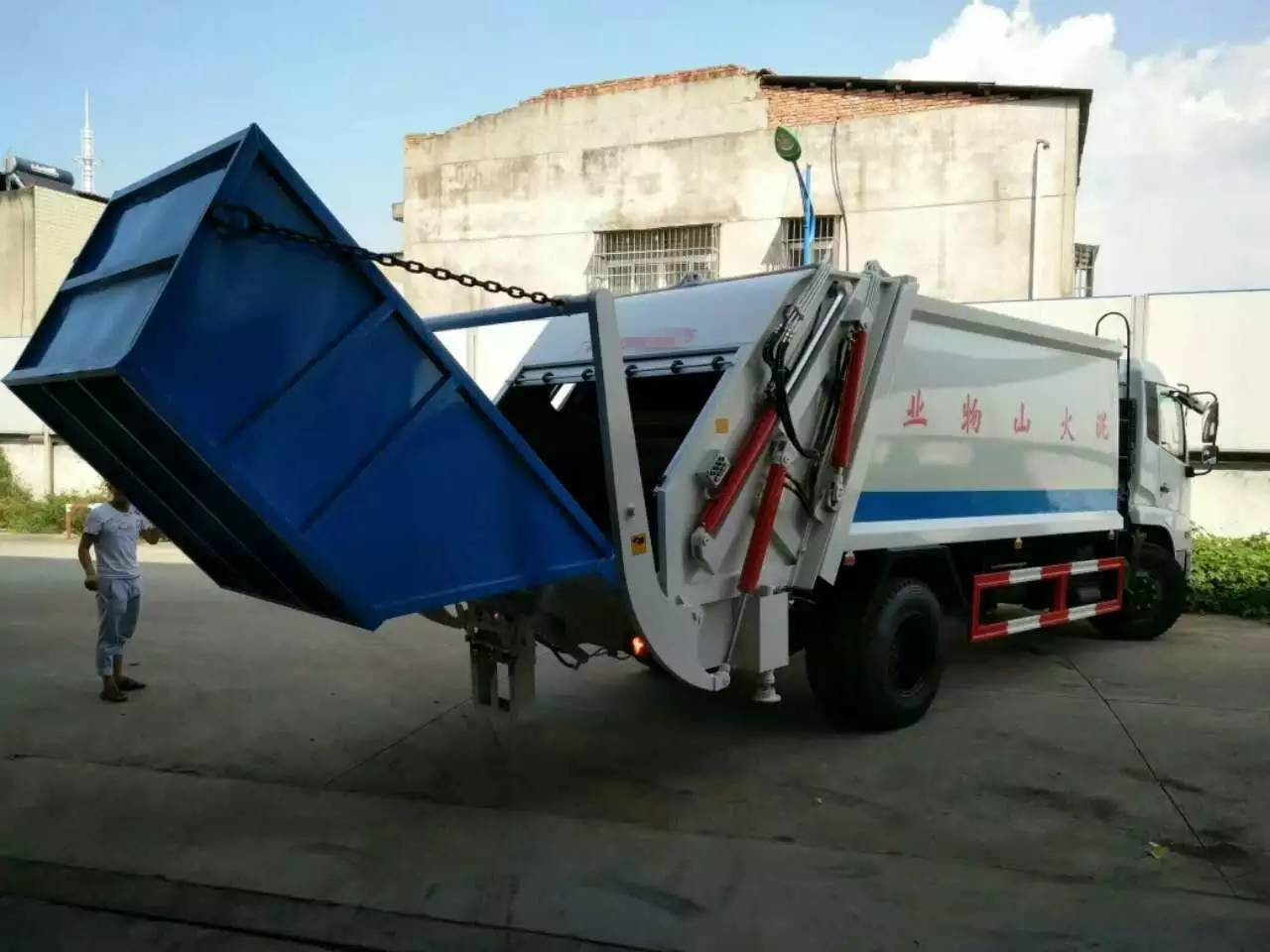 選裝多種翻桶(斗)機構(gòu) 不同用戶可根據(jù)不同的垃圾搜集方式,選裝不同的翻桶(斗)機構(gòu):翻標準垃圾鐵桶ZBT59003-88(300 L)、塑料垃圾桶(240L)、隨車小垃圾斗、密封遮蓋式垃圾斗、大垃圾斗。